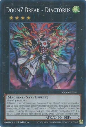 If this card is Special Summoned: You can destroy 1 "DoomZ" card in your hand or face-up field, then you can destroy 1 monster on the field. If this card is destroyed by card effect while it has a "DoomZ" monster or "Medius the Pure" as material: You can take 1 Equip Spell from your Deck and either add it to your hand or send it to the GY. You can only use each effect of "DoomZ Break - Diactorus" once per turn.